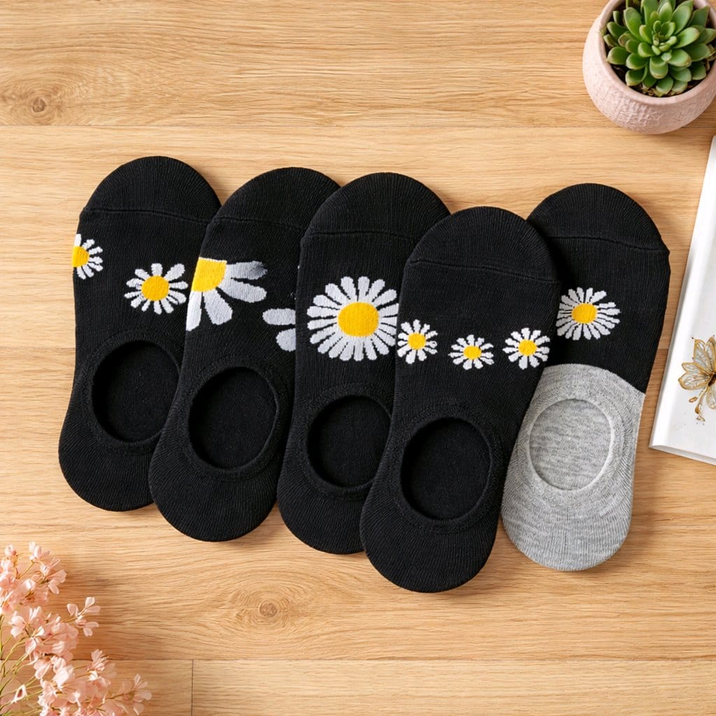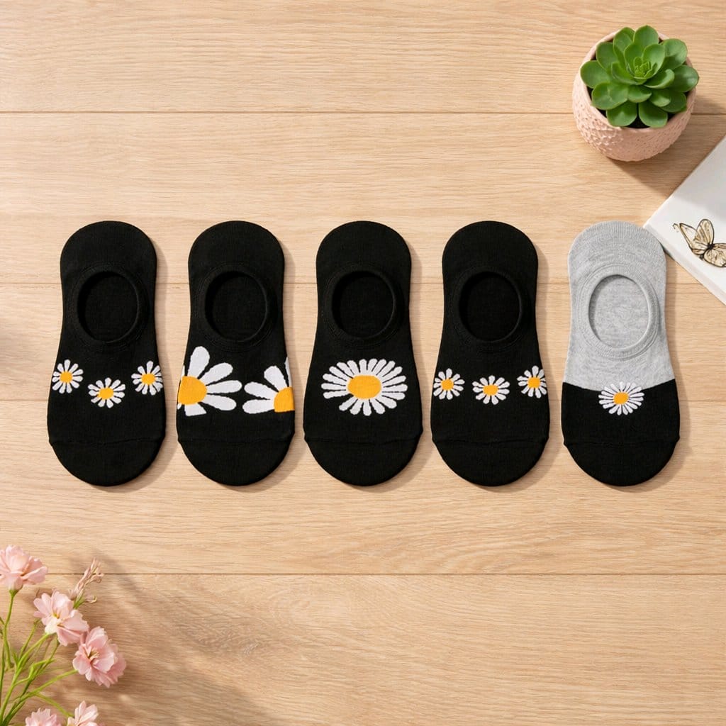 Nizke nogavice z ljubkimi vzorci marjetic prinašajo svežino in igrivost v vaš vsakdanji videz. 🌸