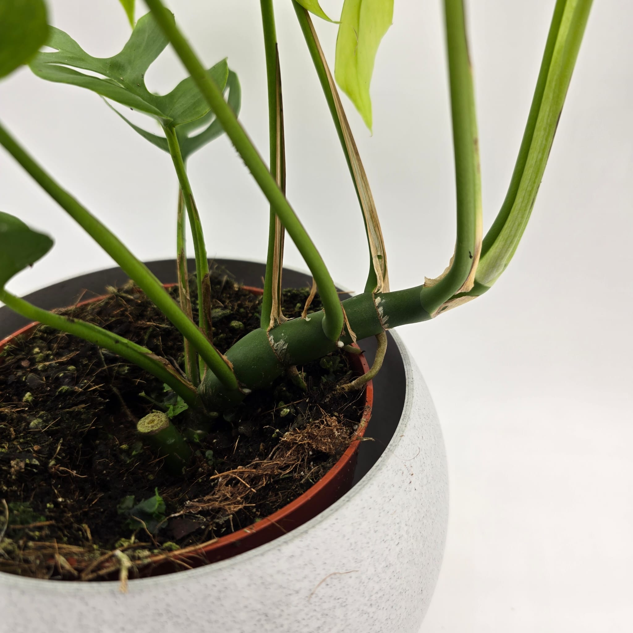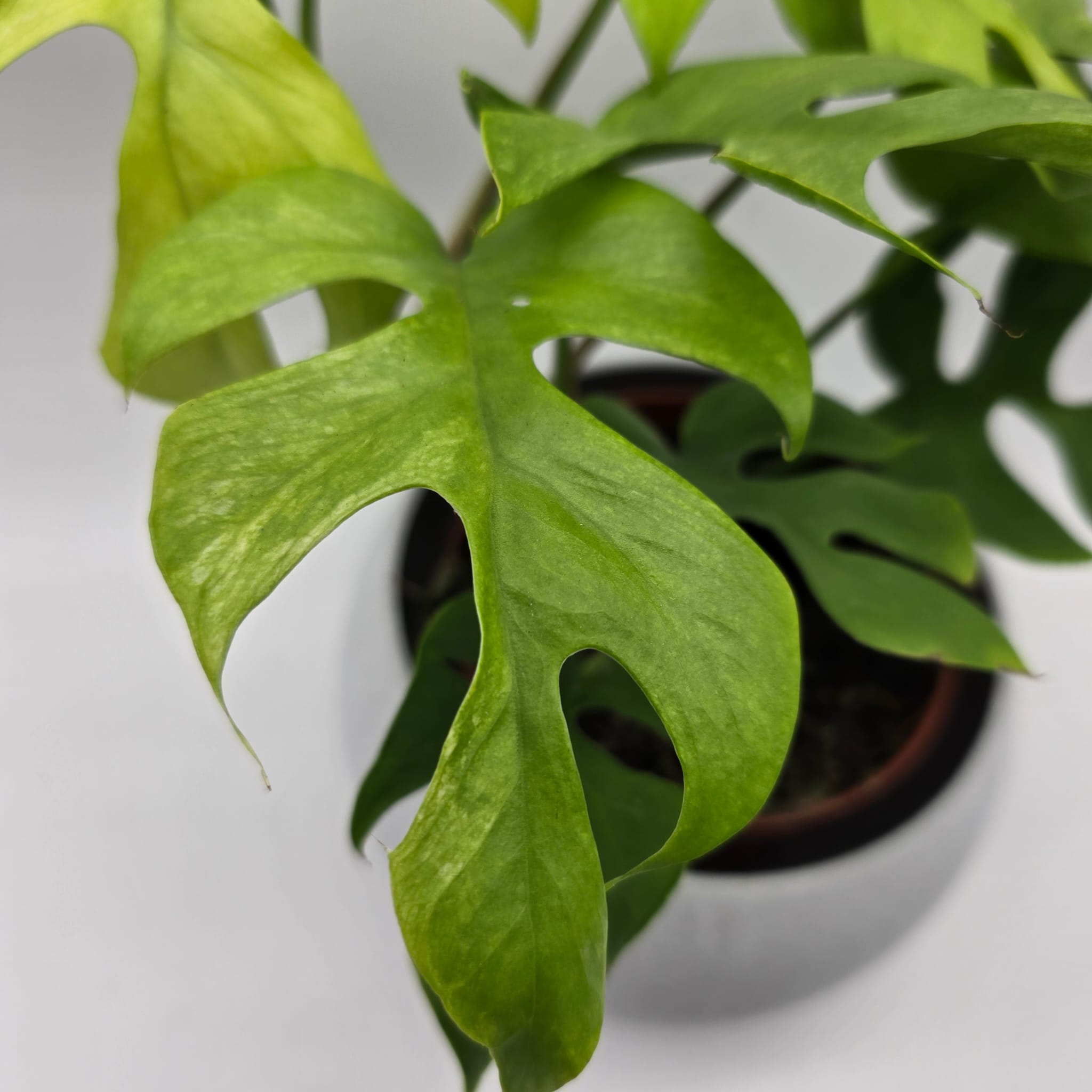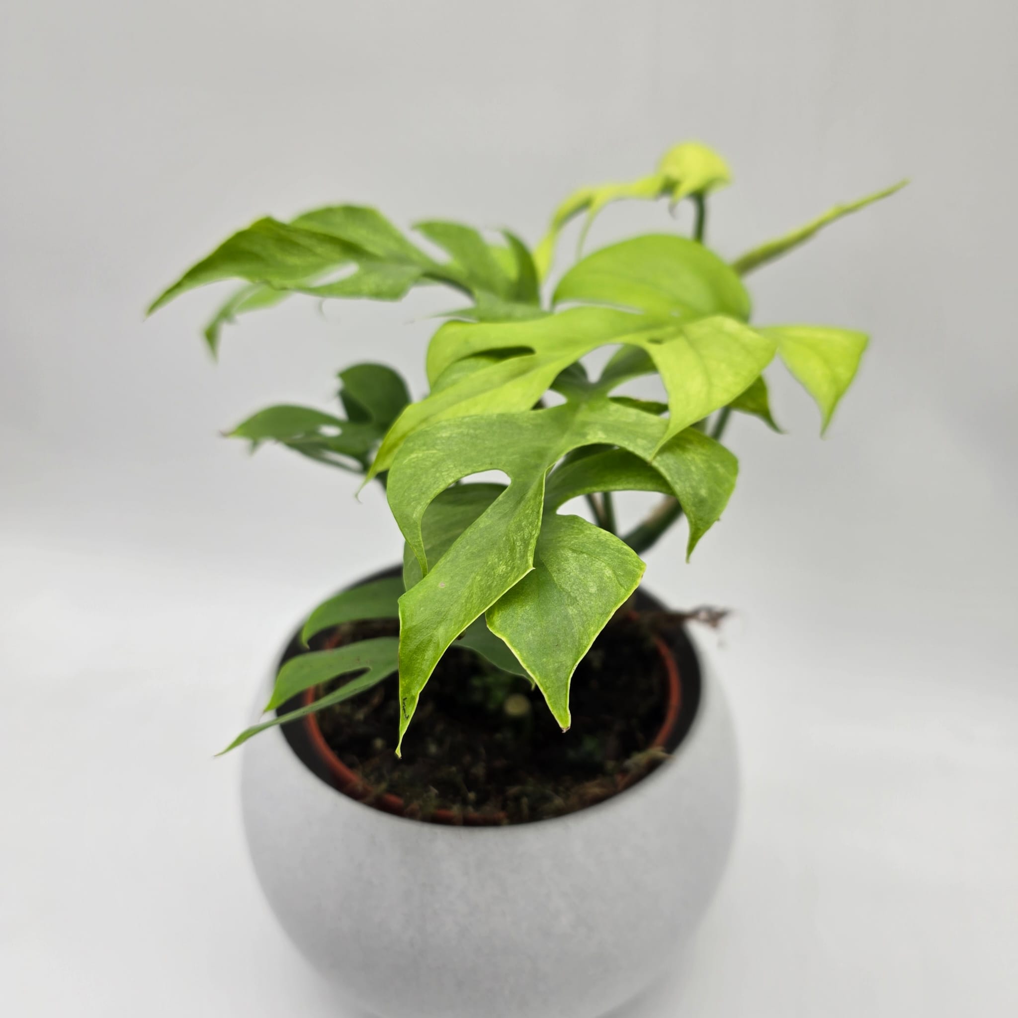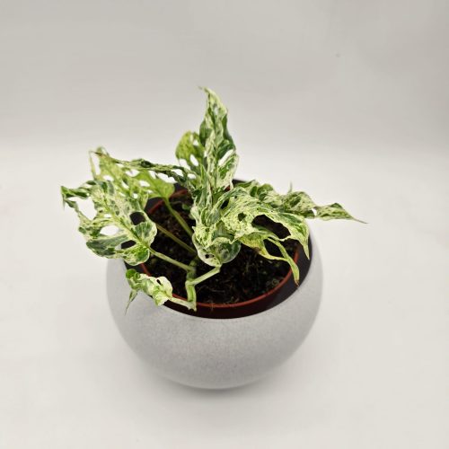 Rhaphidophora tetrasperma ‘Goldrush’ je redka variegirana sorta z živahnimi rumeno-zlatimi vzorci na listih, ki ustvarjajo močan tropski poudarek v prostoru. Hitro rastoča in enostavna za nego, najbolje uspeva na svetli posredni svetlobi z zmernim zalivanjem.